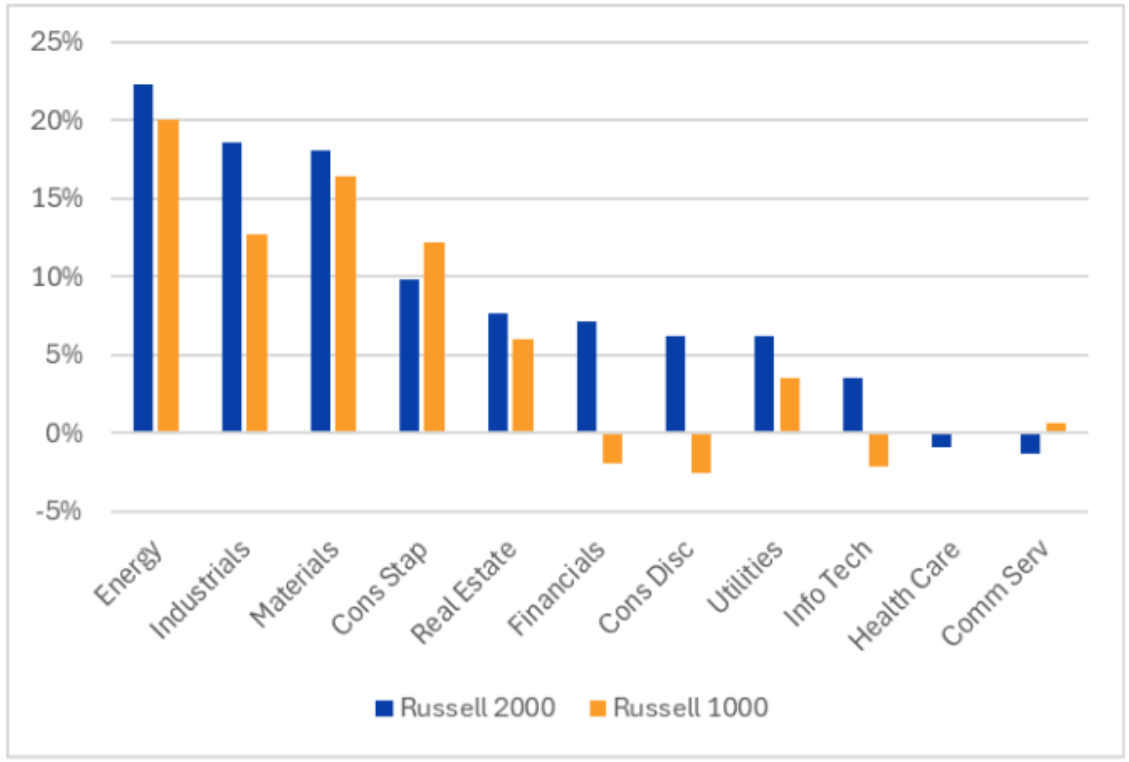 The Materials sector in the Russell 2000 benefited from stronger domestic demand in aggregates, metals, and chemicals, aligning more closely with reshoring and infrastructure than globally oriented large caps.