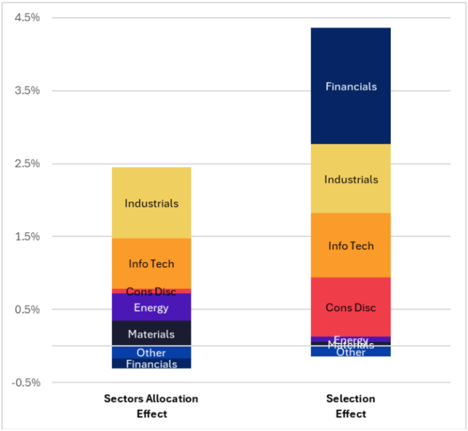 - Four sectors – Financials, Industrials, Information Technology, and Consumer Discretionary – drove most of the outperformance of small caps.