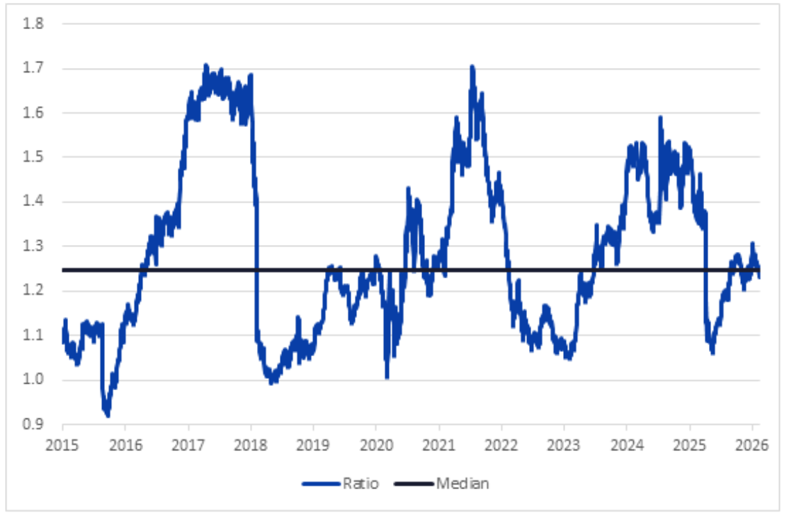 The gap between Russell 2000 and Russell 1000 Financials reflects differences in business mix, rate sensitivity, and policy exposure. Small cap Financials, dominated by regional and community banks, niche lenders, and smaller insurers, benefited quickly from late-2025 rate cuts, which reduced funding costs and improved net interest margins. Their fortunes are closely tied to domestic activity and small business lending, both of which strengthened in 2026.