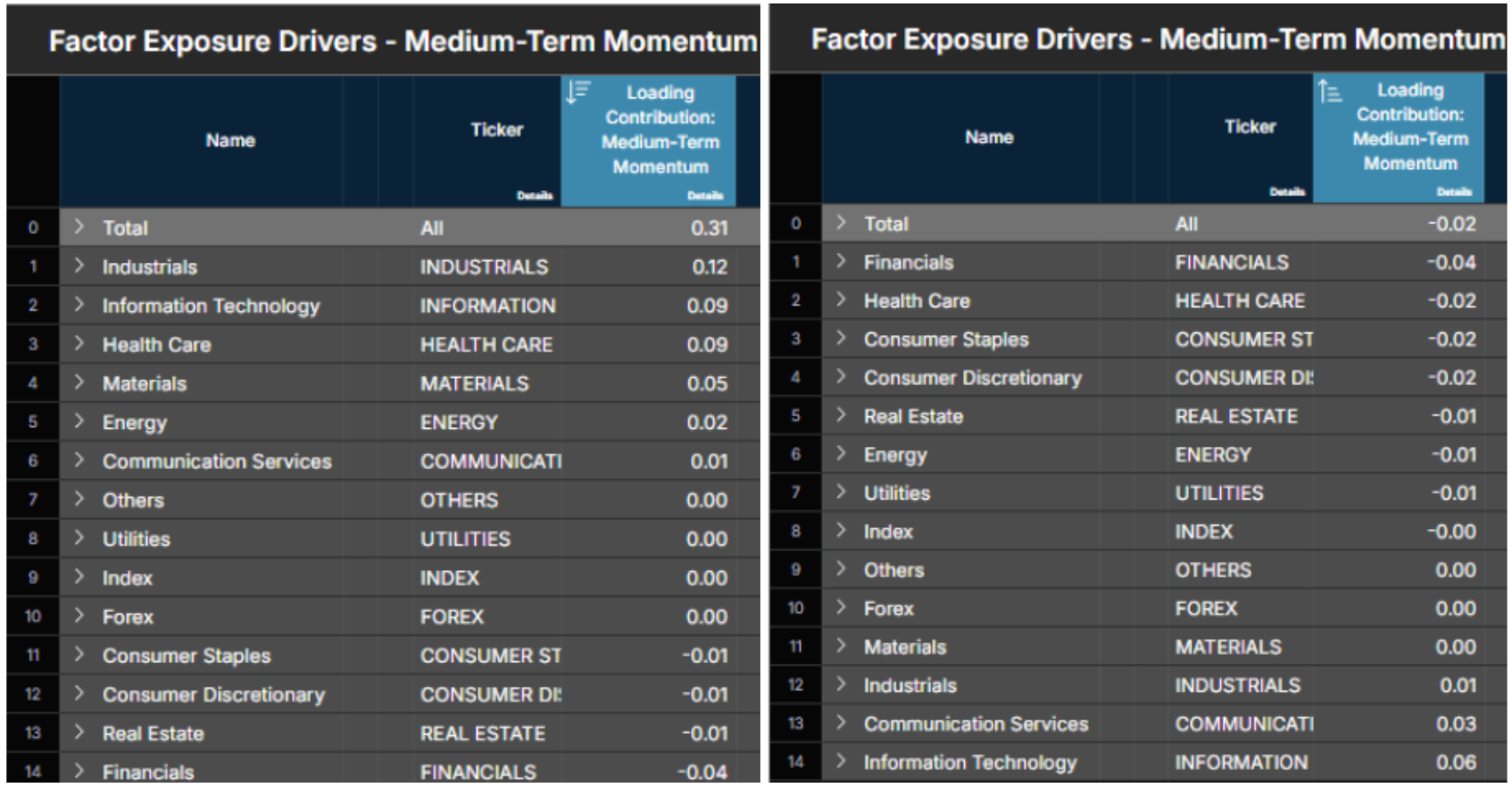 Momentum Exposures by Sector: Russell 2000 (left), Russell 1000 (right)