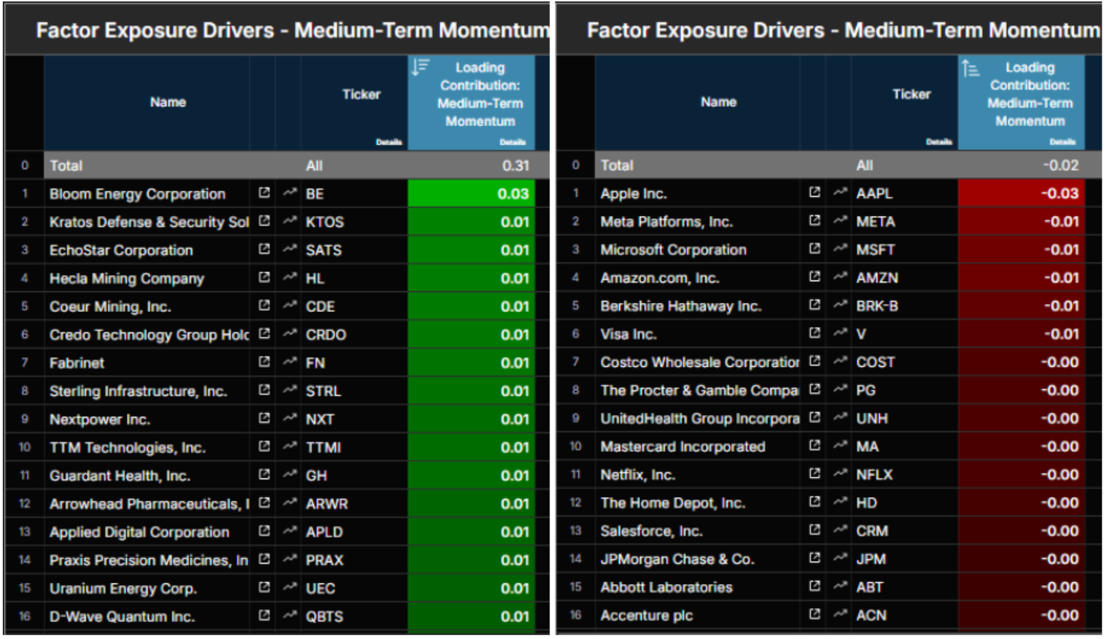 Idiosyncratic stock movements (firm-specific news and events) made a surprisingly large negative contribution to Russell 1000 returns. This is reflected in the strongly positive contribution of the Residual factor to the Russell 2000’s relative return. A typical interpretation of the negative Residual Return contribution for large caps is that several heavyweight names, including Apple (AAPL), Nvidia (NVDA), Broadcom (AVGO), JPMorgan Chase (JPM), and Qualcomm (QCOM), declined due to company specific developments rather than macroeconomic conditions. As we will see in the analysis below, some portion of this contribution may in fact reflect a trend not captured by the fundamental factors.