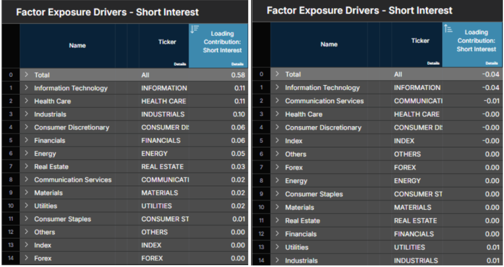 Short Interest Exposures by Sector: Russell 2000 (left), Russell 1000 (right)