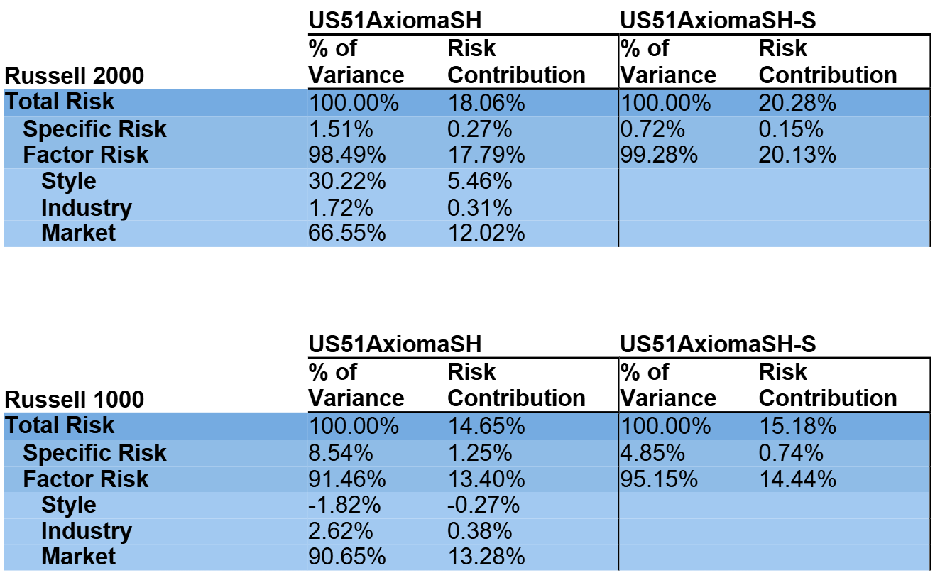 For the Russell 2000, factor contributions to risk are about 99% of total risk under both the fundamental and statistical variants of the Axioma US5.1 model, leaving roughly 1% to residual.