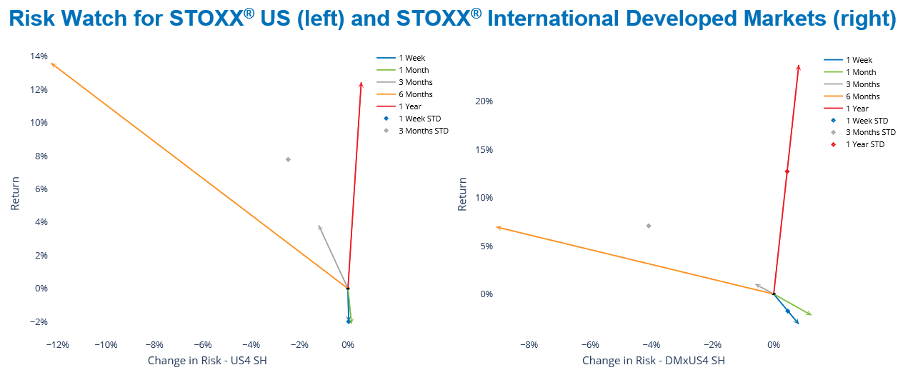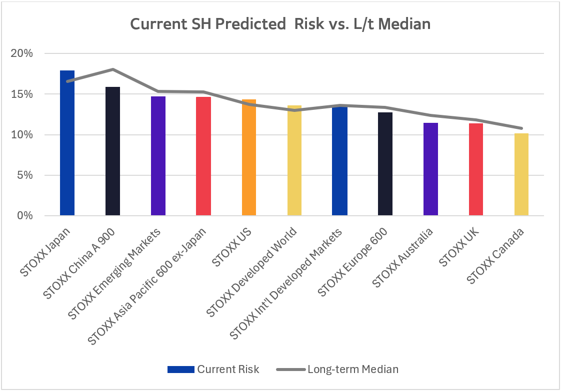 Over the past three months, predicted risk has declined for many benchmarks, with reductions (proportional to the beginning level) ranging from -1% for STOXX Japan to -10% for STOXX Developed World. US risk fell 8%. Conversely, risk rose for STOXX Emerging Markets, STOXX Australia, Canada, and especially China A 900, where it surged 22%.