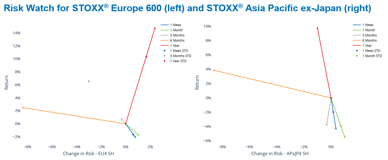 See charts from the STOXX US, STOXX International Developed Markets, STOXX Europe 600, STOXX Asia Pacific ex-Japan Equity Risk Monitors as of November 21, 2025:
