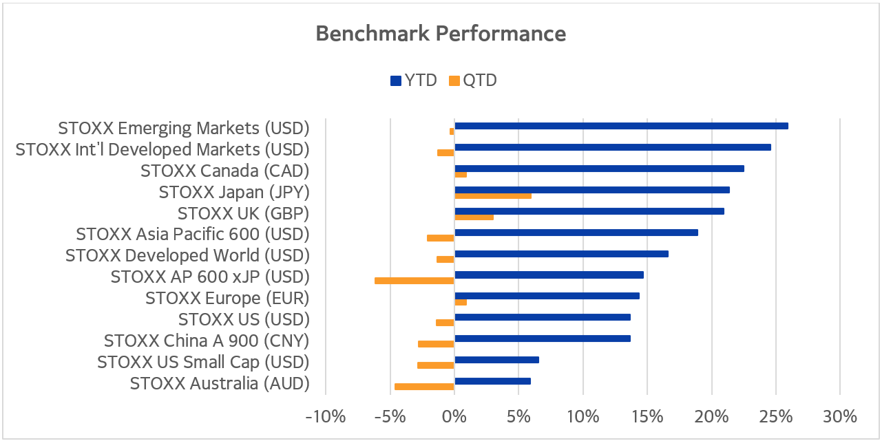 Year-to-date, most major indices still show gains, led by Emerging Markets and Developed Markets ex-US. Asia Pacific ex-Japan, which had significantly outperformed earlier in the year, now holds only a slight lead over the US and Europe.
