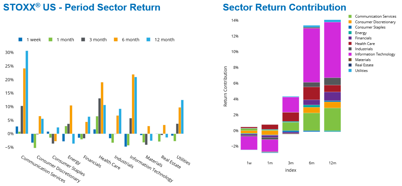 Driven by its heavy index weight of 35%, Info Tech accounted for nearly all (86%) of the STOXX US weekly decline. Still, six other US sectors also fell, amplifying the tech-led selloff.