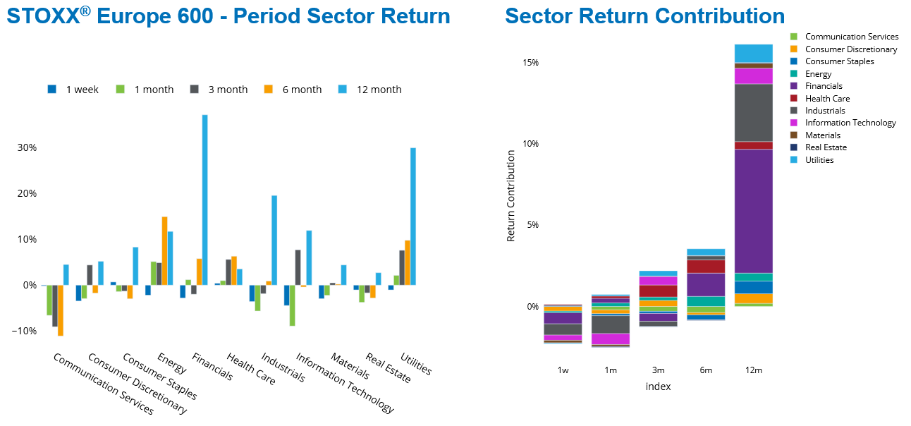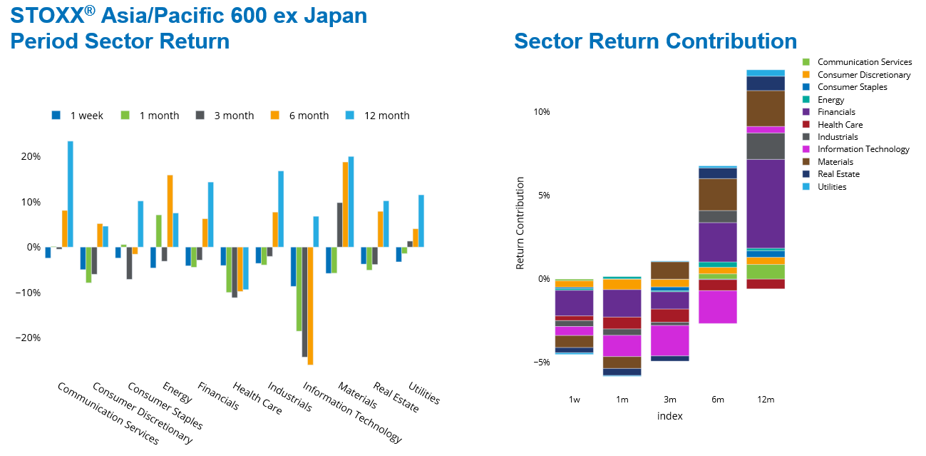 In Europe, Industrials and Financials—the region’s largest sectors—were the primary drivers of the STOXX Europe 600 weekly drop, while Info Tech and Consumer Discretionary ranked third and fourth. Most other European sectors also posted small negative contributions, except Consumer Staples and Health Care.