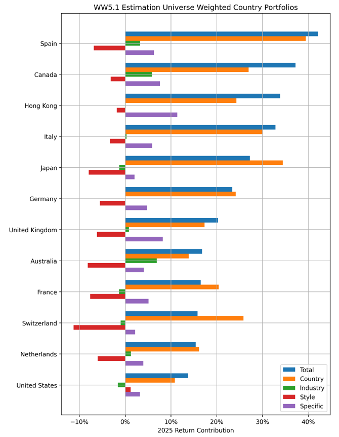 Last week, we reviewed 2025 from the vantage point of index returns, but this week we are going to take a different approach. Here, we created a portfolio for the developed countries with the largest stock markets weighted by the Axioma World Wide 5.1 Estimation Universe (i.e. the inverse of the asset’s square root of market cap).