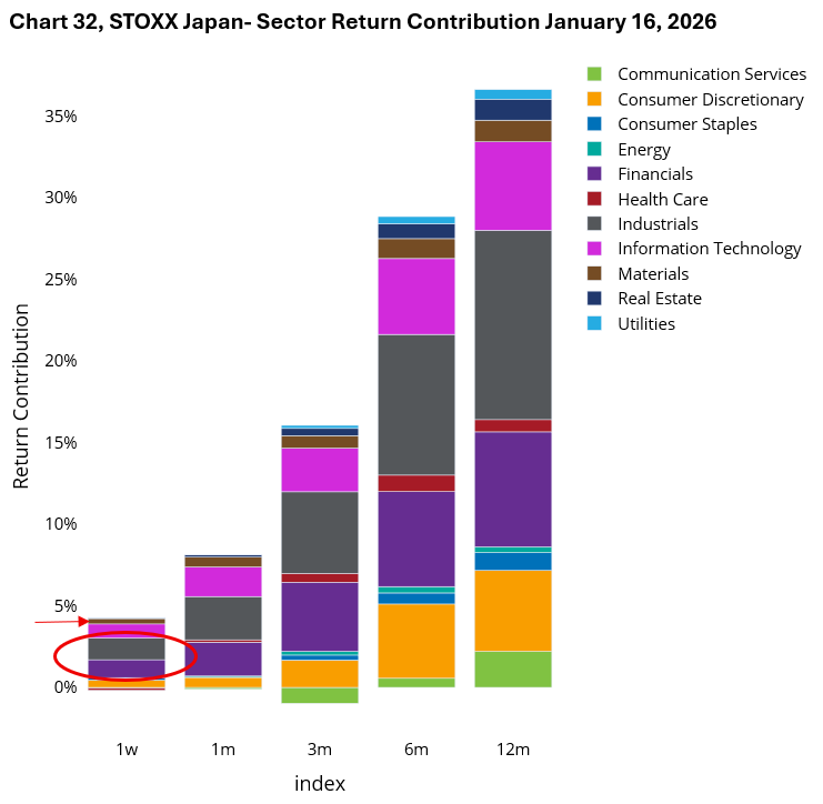While geopolitical headlines last week mainly concerned themselves with President Trump’s quizzical push to “own” Greenland, other shifts were underway as well. First-year Prime Minister Takaichi’s proposal of snap elections in Japan led to higher expectations of fiscal stimulus, which induced a sell-off in long-end Japanese Government Bonds and consequently a rally in Japanese Financials stocks (+4.97%). While the JPY/USD rate did not change meaningfully over the course of the week, Industrials and Materials rallied as well (due to expectations for political support of a strong export environment (weak Yen):