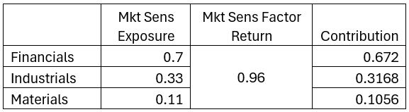 Industrials were up 3.75% while Materials were up 6.11%. Materials are hard to make out in the stacked column above due to their relatively small index allocation (4.5%) while Industrials and Financials are the largest and second largest (26%, 16.5% respectively) sectors in the STOXX Japan index. All three sectors have meaningful exposure to Market Sensitivity as well and that factor had a 0.96% return for the week: