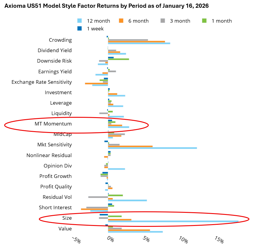 Although the US market as represented by the Russell 1000 was up about 1.6% through Jan. 16th, the Size factor, which had it’s largest annual return ever in 2025, has been no help. Year to date, Size is down 7 basis points (bps), with a stunning reversal last week, falling 118 bps. In the meantime, Medium-Term Momentum is up 90 bps YTD and was up 57 bps last week.