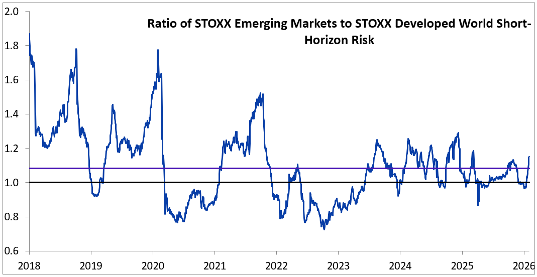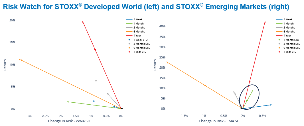 See charts from the STOXX Developed World and STOXX Emerging Markets Equity Risk Monitors as of January 30, 2026: