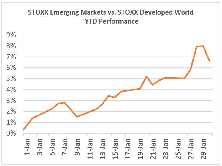 Together, these dynamics have positioned Emerging Markets for continued relative strength as the year unfolds. The STOXX Emerging Markets Index has advanced 9% year to date—more than two standard deviations above expectations based on the risk forecast at the beginning of the year—whereas the STOXX Developed Markets Index rose roughly 2%, a move that remained within its anticipated range at the start of the year, based on Axioma’s EM4 and WW4 fundamental short horizon models.