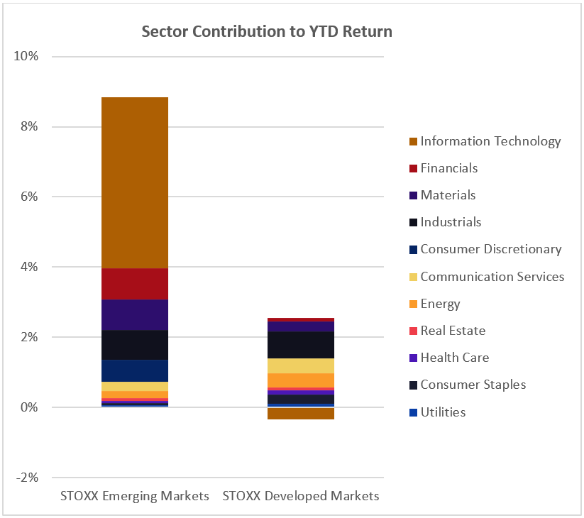 Sector composition continues to shape performance meaningfully. Information Technology remains the largest sector in both Emerging Markets (26% weight) and Developed Markets (29% weight) , yet its impact diverged substantially. In Emerging Markets, the sector contributed more than half of the year to date gain. In contrast, it was the sole laggard in Developed Markets.