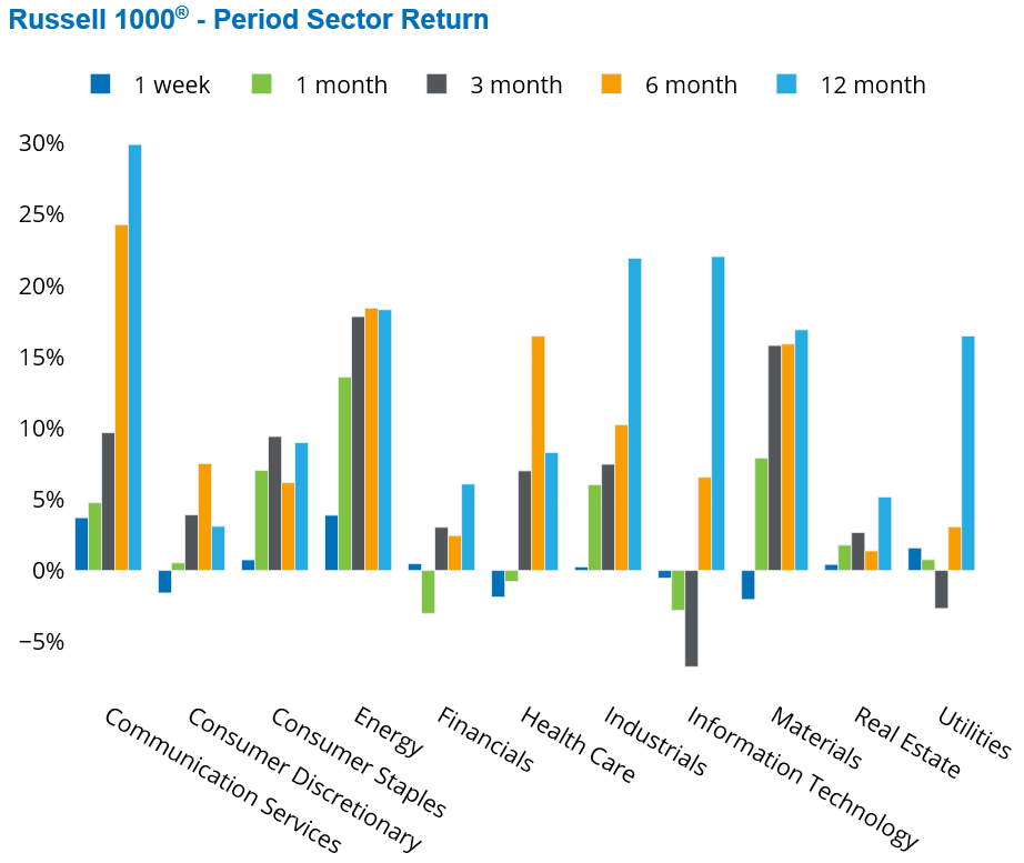 Energy has been the standout performer both last week and year to date among the Russell 1000’s 11 GICS sectors, delivering a one month return near 15%. The surge was driven by rising oil prices amid heightened geopolitical tensions surrounding Iran, unexpected supply disruptions, and bouts of severe winter weather that tightened near term availability and added a risk premium to the market. Energy outpaced the next strongest sector, Materials (9%), by five percentage points. By contrast, Financials (-2.25%) and Information Technology (-1.94%) have been the weakest US sectors so far in 2026.