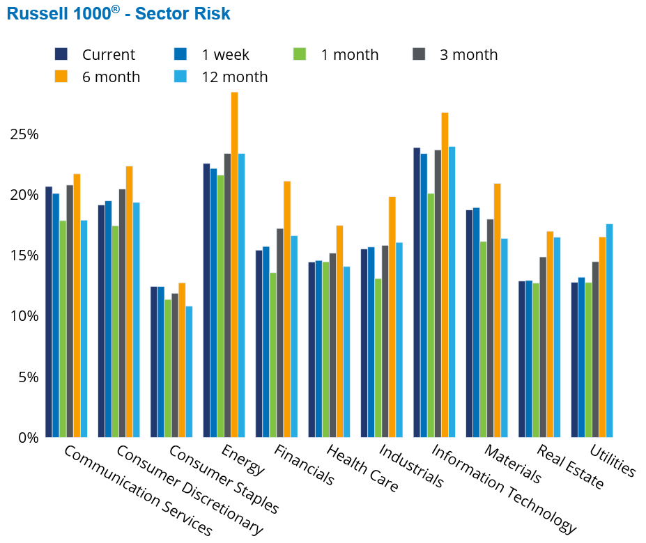 Despite comprising only 3% of the US equity market, Energy was responsible for 30% of the Russell 1000’s year to date advance. Although it ranks as the second riskiest sector, trailing only Technology, its small weight meant Energy contributed little to the Russell 1000’s risk.