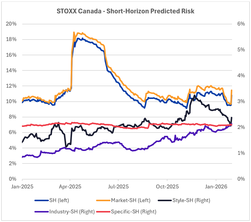 STOXX Canada experienced the sharpest rise in risk among major regions last week, increasing 13%, as measured by the Axioma Canada fundamental short-horizon model. While Market Risk drove the overall jump in Total Risk, Style Risk also climbed. Notably, Industry Risk did not spike abruptly; rather, it has been rising steadily over the past six months. Specific Risk, which represents only a small proportion of index risk, remained steady.