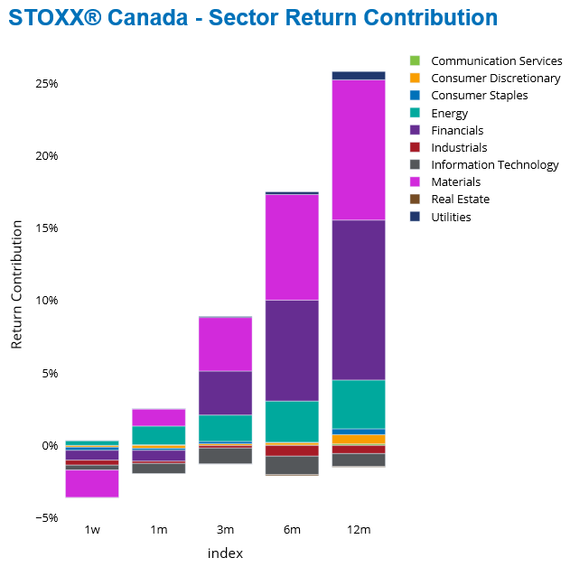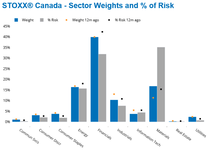 Most Canadian sectors declined last week, with the exception of Energy, Communication Services, and Utilities. Materials suffered a severe drop of nearly 10%, while Information Technology fell 8%. Materials alone accounted for almost 60% of the Canadian market’s weekly decline. Although it is the second largest sector in STOXX Canada (at 17% weight)—less than half the weight of Financials (40%)—its contribution to benchmark risk (35%) exceeds that of Financials (32%), underscoring its outsized influence on both risk and returns.