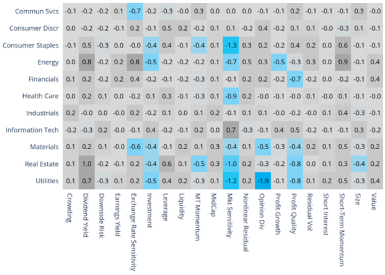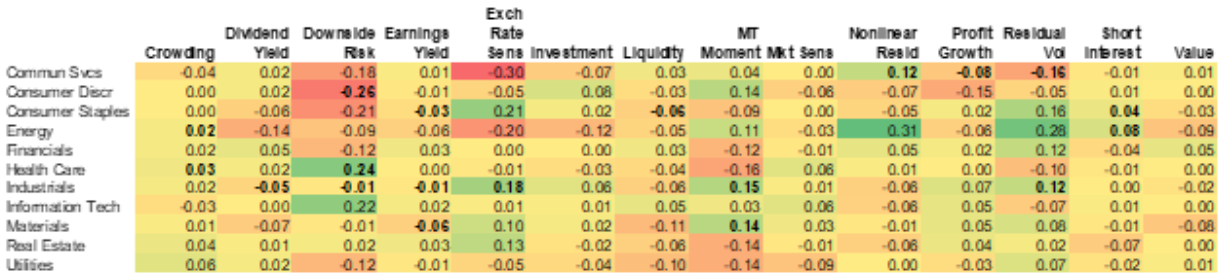Downside Risk for Health Care went from negative to positive, but Health Care’s Medium-Term Momentum exposure fell more than the exposure of any other sector (from slightly negative to even more so). Industrials saw their Exchange Rate Sensitivity and Medium-Term Momentum exposures move from close to zero to positive. Information Technology’s Downside Risk became more positive, although its Residual Volatility dropped slightly.