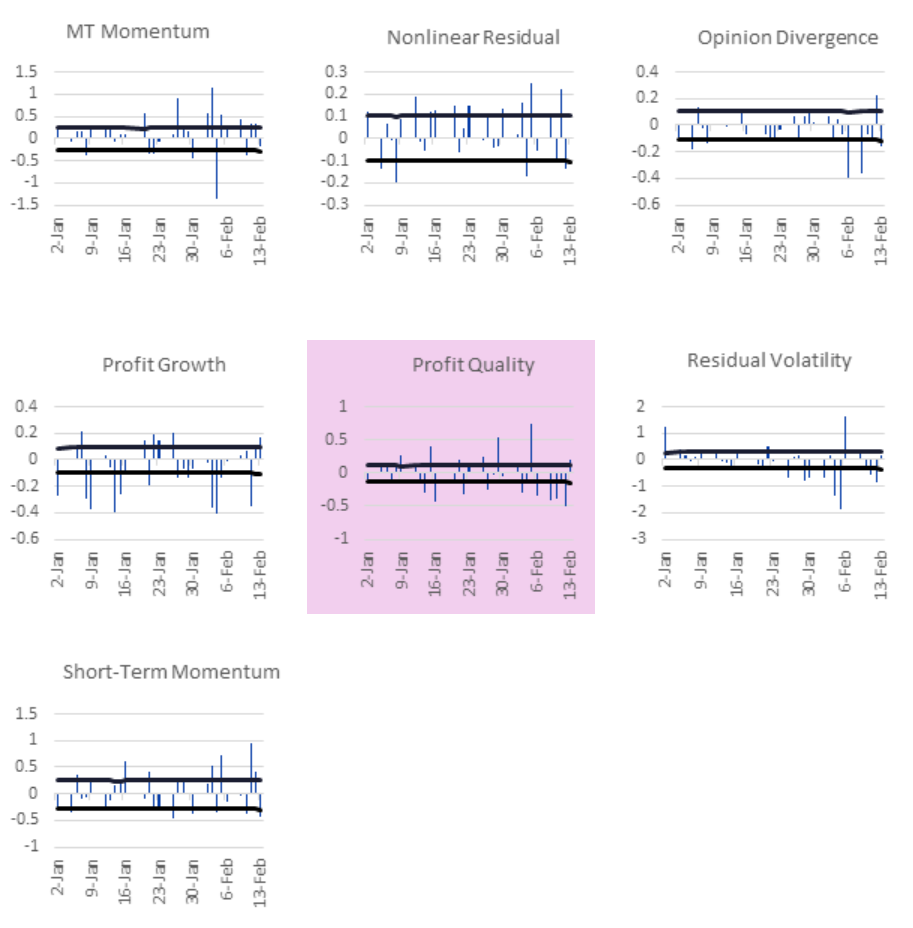 Opinion Divergence and Profit Growth had three days with high magnitude returns and Short-Term Momentum and Residual Volatility had four such days, but perhaps the most interesting was Profit Quality, where returns fell outside the two-standard-deviation range all five days last week, four of the days saw negative returns (when expectations are positive), and the factor only “recovered” on Friday. Overall, the factor’s return was more than three standard deviations below the long-term five-day average last week.