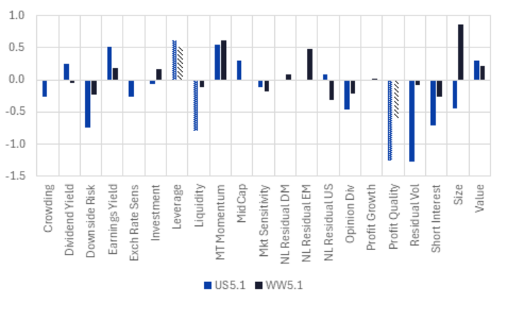 We focus on the US5.1 model here because we did not see the same level of daily fluctuations in the WW5.1 (Worldwide) model. In that model, most factors experienced at most one day of outsized return. Leverage and Profit Quality were the only factors to see two days falling outside the range, and no factors had more. These big factor moves and day-to-day whipsawing seem to be a US-only phenomenon.
