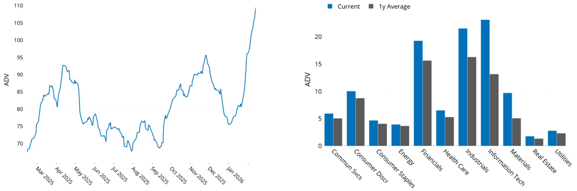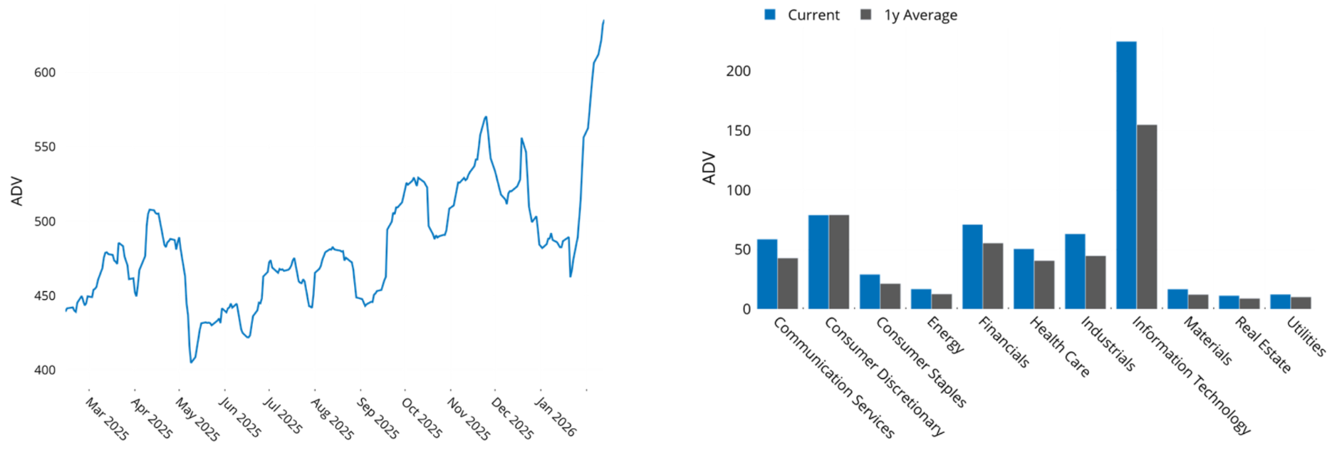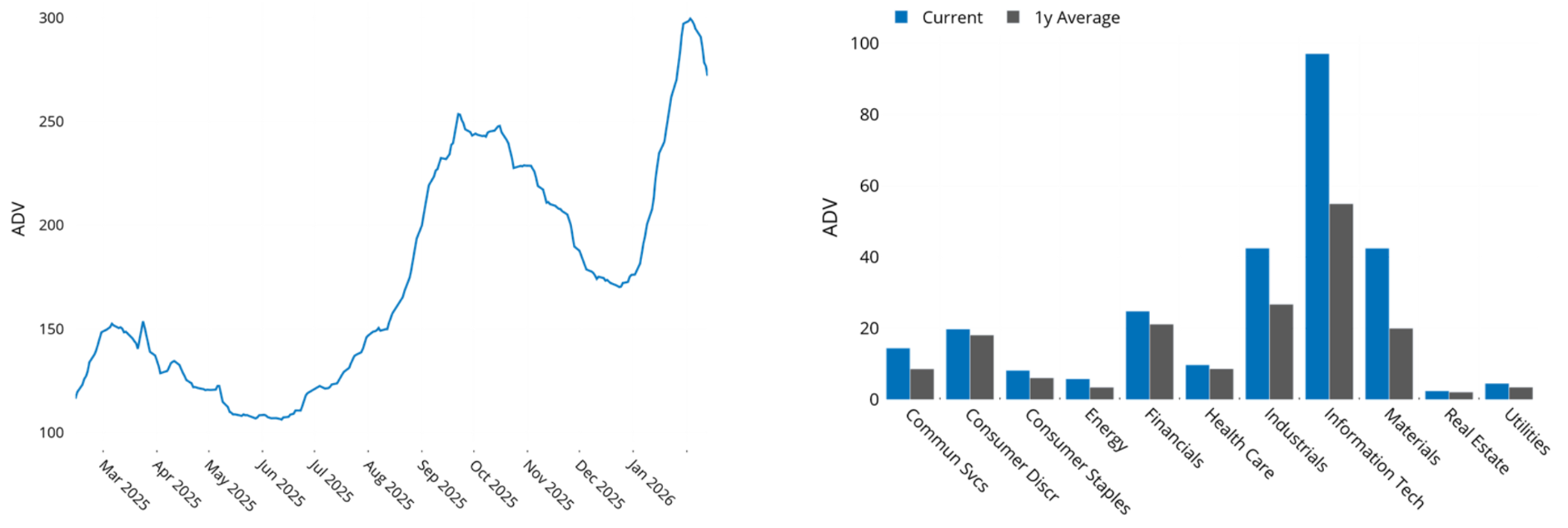 These increases are far in excess of what can be explained by market cap gains in the indices and are evident in almost every sector. In the US and Emerging Markets, the biggest gains have been seen in Information Technology, while Materials, where volume has increased threefold versus a year ago, has taken the lead for Developed Markets ex-US.