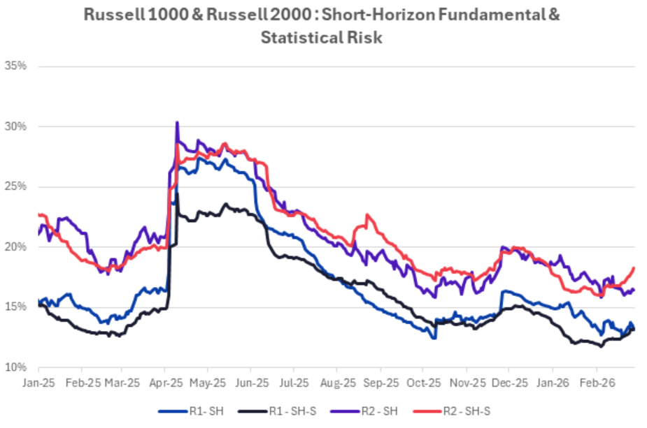 Risk rose for both the Russell 1000 and Russell 2000, with statistical forecasts increasing more than fundamental ones in the US4 All Cap and Small Cap short horizon models. For the Russell 1000, the two views aligned, but in the Russell 2000 the statistical estimate exceeded the fundamental one, suggesting that the statistical model may be capturing short-term dynamics that the fundamental model is missing.