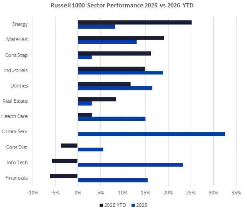 Two months into 2026, sectors that lagged last year within the Russell 1000 have climbed to the front of the pack. Even so, investors have not shifted entirely into defensive mode, as non-tech cyclical segments continue to deliver solid performance.