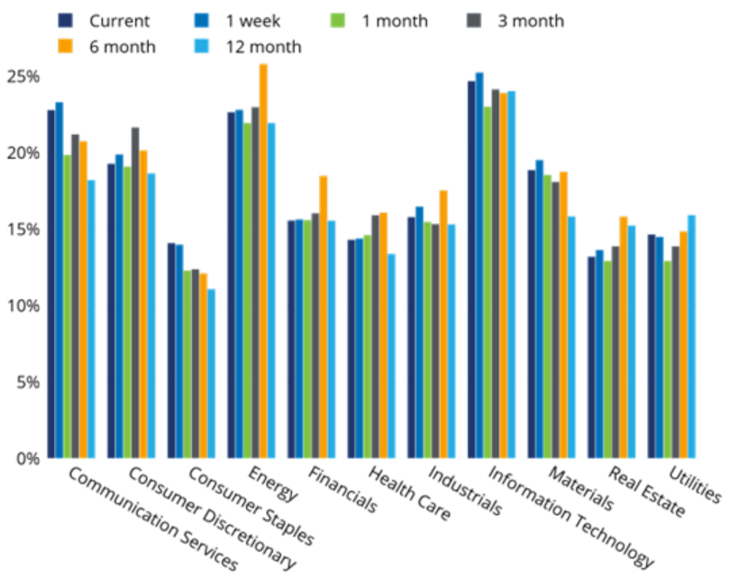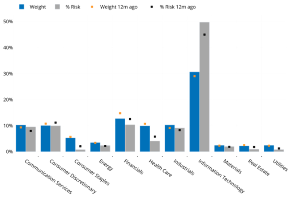 At present, Information Technology remains the riskiest sector, followed by Communication Services, with Energy close behind. Due to its dominance in the US market, Information Technology is responsible for nearly half of the Russell 1000’s risk while Energy’s contribution to the index risk is even less than its small weight (3%).