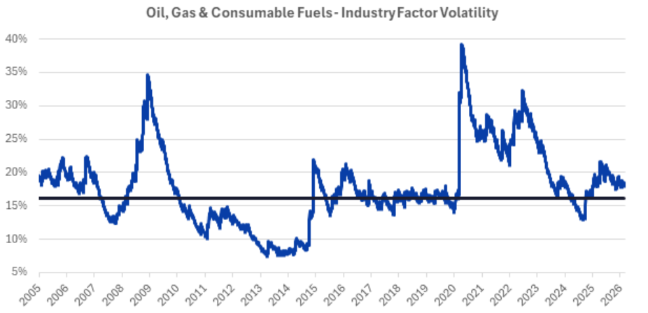 Within Axioma’s US5.1 fundamental short horizon model, the Oil, Gas & Consumable Fuels Industry Factor has climbed sharply in 2026—well before the latest escalation involving Iran. The rise reflects not only geopolitical concerns but also unexpected supply disruptions and severe winter weather that tightened short-term availability and introduced a risk premium into the market. After declining throughout 2025, the factor has reversed direction, rising 16% over the past two months.