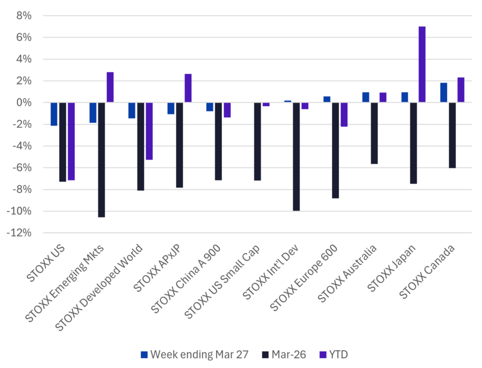 The US equity market fared the worst of any of the major markets last week, dragging the year-to-date return to the lowest of the 11 markets as well. For March it falls in the middle of the pack.