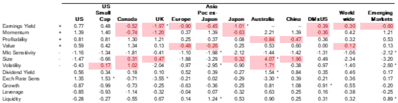 The table below is similar to what we show in our quarterly Insight presentation (register for the upcoming webinar here), but sorted slightly differently and highlighting where a factor in a region has the opposite sign to what is expected in pink. The asterisks continue to signify where the return fall outside a two standard deviation band. The “+” or “-“ next to the factor name is the expected sign, if the factor is believed to have a long term risk premium.