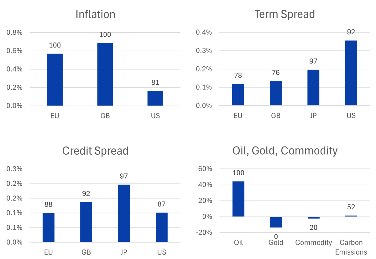 Sharply higher oil prices as a result of the Iran war and closing of the Strait of Hormuz has had a dramatic effect on inflation expectations. Both EU and GB Inflation’s returns (based on changes in 5-year break-even inflation) were the second-highest in the history of the model. While US Inflation’s return was not quite as historically high, it was in the top quintile.
