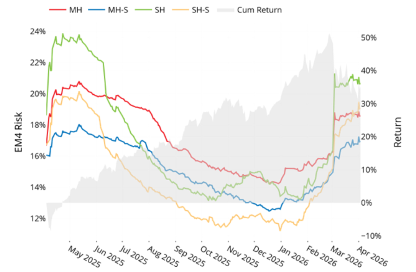 Prior to this war-related correction (drawdown?), the EM index had been on a tear, rising 48% between May 2025 and the end of February 2026. On December 31, 2025 the average forecast risk over all 4 EM models was just 12.9%, and as of April 3 it is 18.8%.