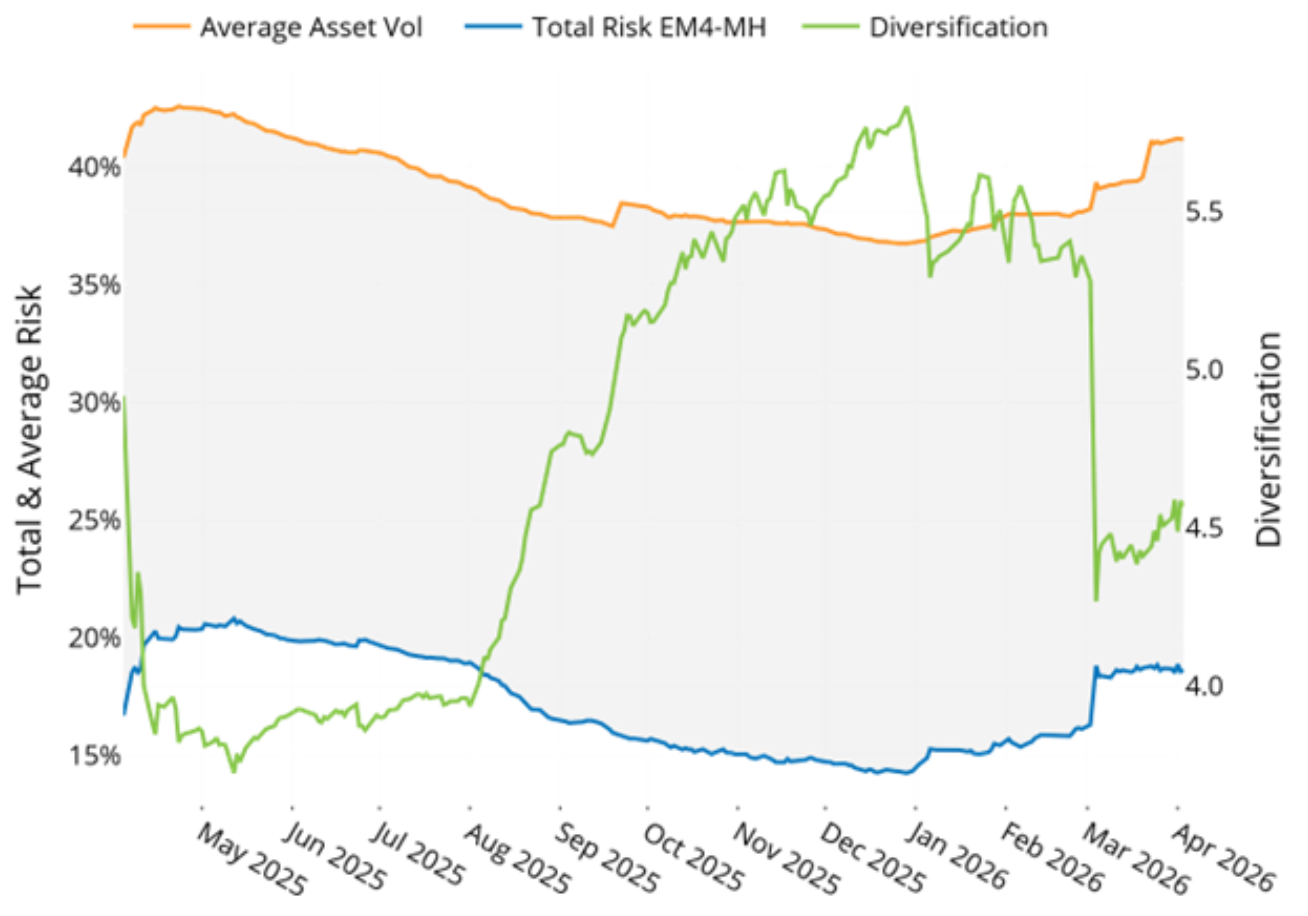 In sharp contrast to the US market, correlations in Emerging Markets are soaring to “Liberation Day” levels and the index “Diversification Ratio”, which describes the difference between the weighted average asset volatility and index portfolio volatility has fallen precipitously: