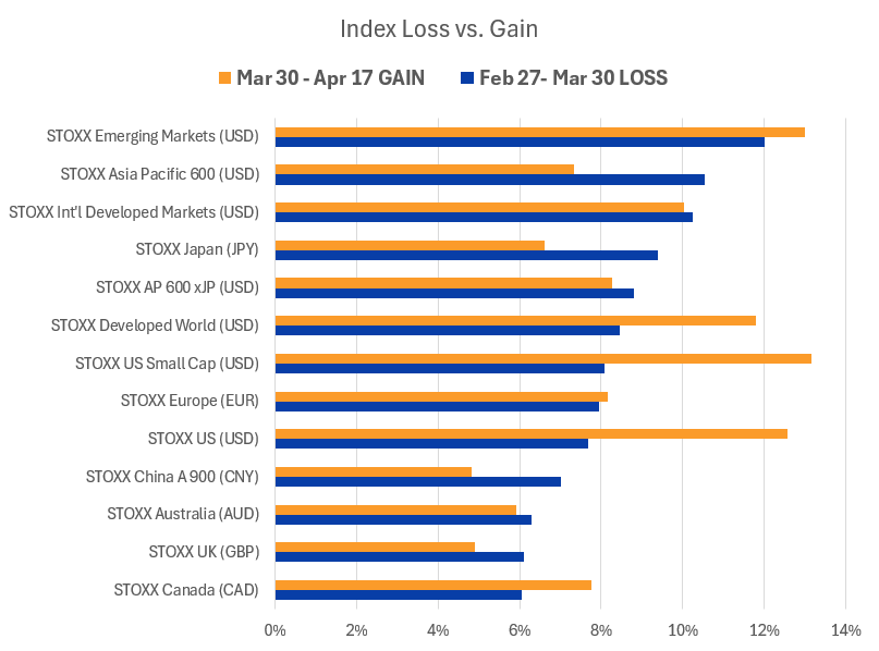 From March 30 to April 17, Emerging Markets and US equities led the recovery, each rising 13%. At the other end of the spectrum, China and the UK lagged, gaining about 5% over the same period.