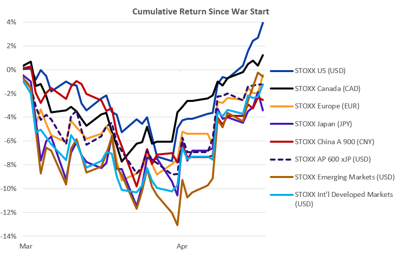 Across regions from the start of the war through last Friday, the US has been the top performer, up nearly 4%, followed by Canada. Most other regions have remained in negative territory since the war began, with Japan the weakest performer.
