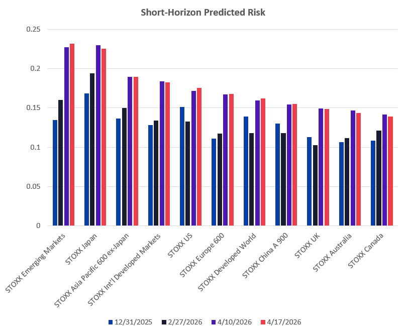 China has experienced one of the most pronounced shifts in risk positioning. After spending most of March as the least risky region, a sharp increase in volatility has pushed it squarely into the middle of the pack.