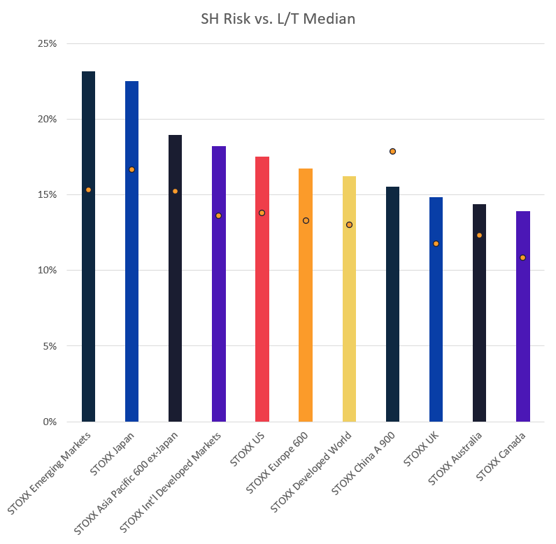 Importantly, current risk levels remain well above their beginning-of-the year levels. For all regions covered by the Equity Risk Monitors, except China, predicted risk is higher than the 14-year median. The gap is especially wide for Emerging Markets and Japan, where risk exceeds long-term medians by eight and six percentage points, respectively—highlighting that while markets may have rebounded, underlying volatility remains firmly elevated.