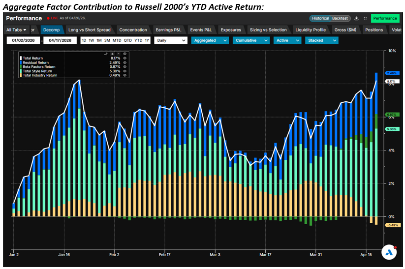 However, factor attribution results suggest an important shift beneath the surface. Based on the Axioma US5.1 fundamental short-horizon model, the Russell 2000’s relative performance since the start of the war has increasingly been driven by style factors and residual returns—capturing idiosyncratic stock-specific movements—rather than industry positioning.