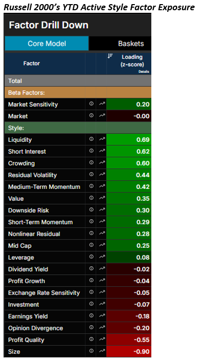 Over the past two weeks in particular, industry effects have diminished and turned slightly negative. Within the industry component, negative contributions from Semiconductors and Technology Hardware more than offset the positive impact from Interactive Media and Software. As a result, the aggregate Industry contribution has exerted a modest drag on the Russell 2000’s active return, reinforcing the idea that Small Cap leadership is no longer industry-driven.