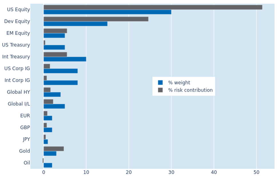 Surging stock market volatility boosted the predicted short-term risk of the Axioma global multi-asset class model portfolio by nearly two percentage points to a 5-month high of 8% as of Friday, November 21, 2025. US equities took the brunt of the increase, with their share of total portfolio volatility expanding by 4.6% to 51.4%. On the flipside, all fixed income holdings experienced a decline in their percentage risk contributions, as interest rates remained decoupled from share prices. US investment grade corporates saw their contribution more than half from 3.2% to 1.5%, but non-US government bonds still added to overall volatility, due to the increased co-movement of stock prices and exchange rates against the US dollar.
