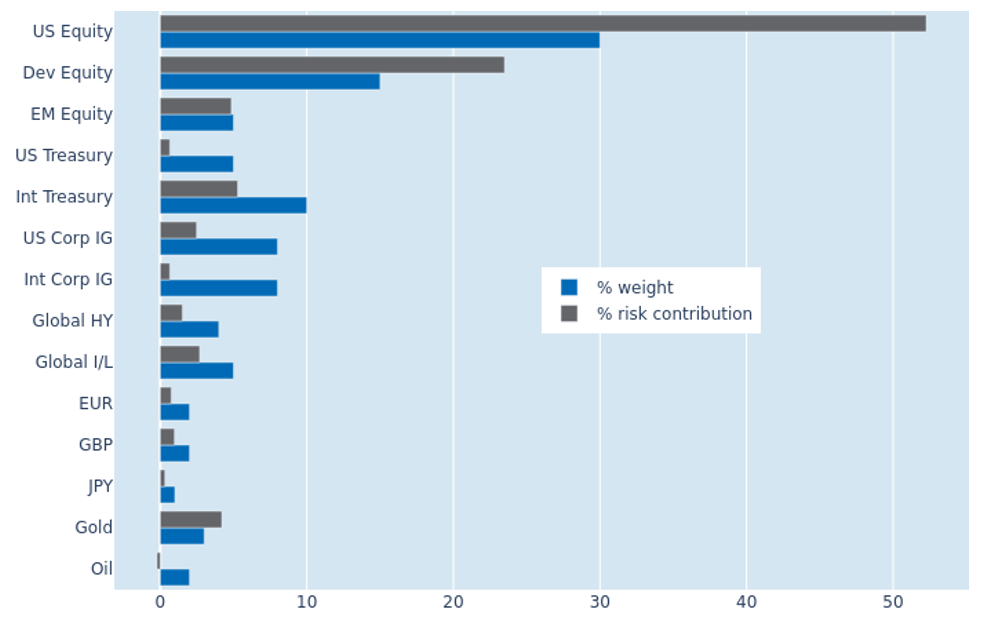 The predicted short-term risk of the Axioma global multi-asset class model portfolio rose by another 1.3% to 9.3% as of November 28, 2025, amid a further increase in stock market volatility. US equities once again recorded the biggest expansion in their share of overall portfolio risk from 51.4% to 52.2%, which makes them the largest contributor not only on an absolute basis, but also relative to their market-value weight of 30%. Gold also added more to overall volatility than its monetary share, due its current co-movement with stock prices and its inverse relationship with the value of the dollar, which makes it appear positively correlated with assets in most other currencies.