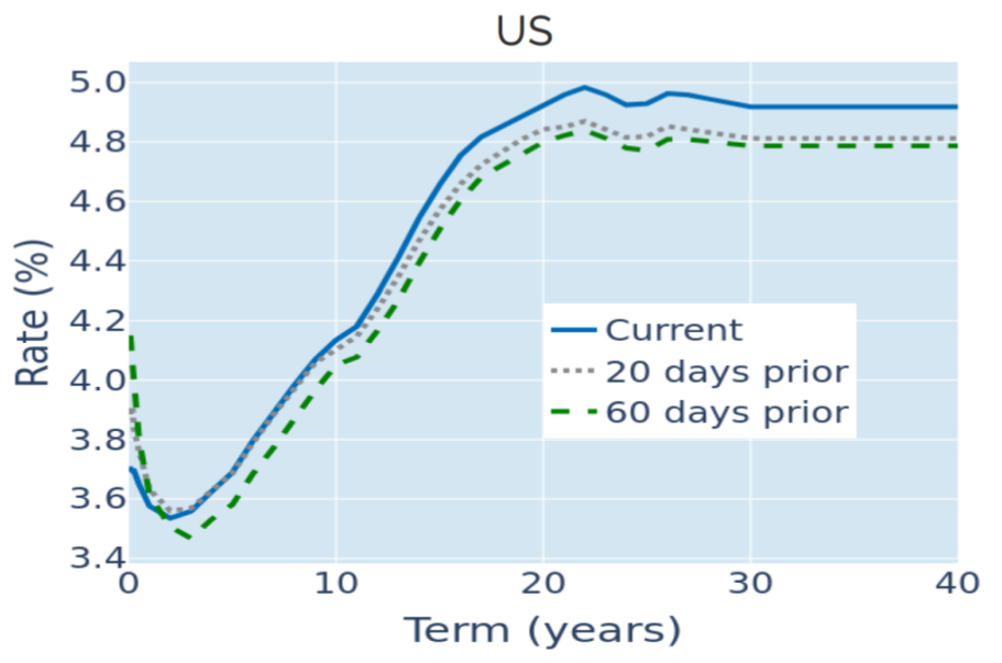 The US Treasury curve steepened in the week ending December 5, 2025, as the global rise in yields pushed long-term borrowing costs up by 12-13 basis points, marking the biggest weekly increase since the capital flight in the wake of the so-called Liberation Day tariff announcements in April. At the same time, the 1-month T-Bill rate plummeted 25 basis in anticipation of further monetary easing at the upcoming FOMC meeting on December 10.
