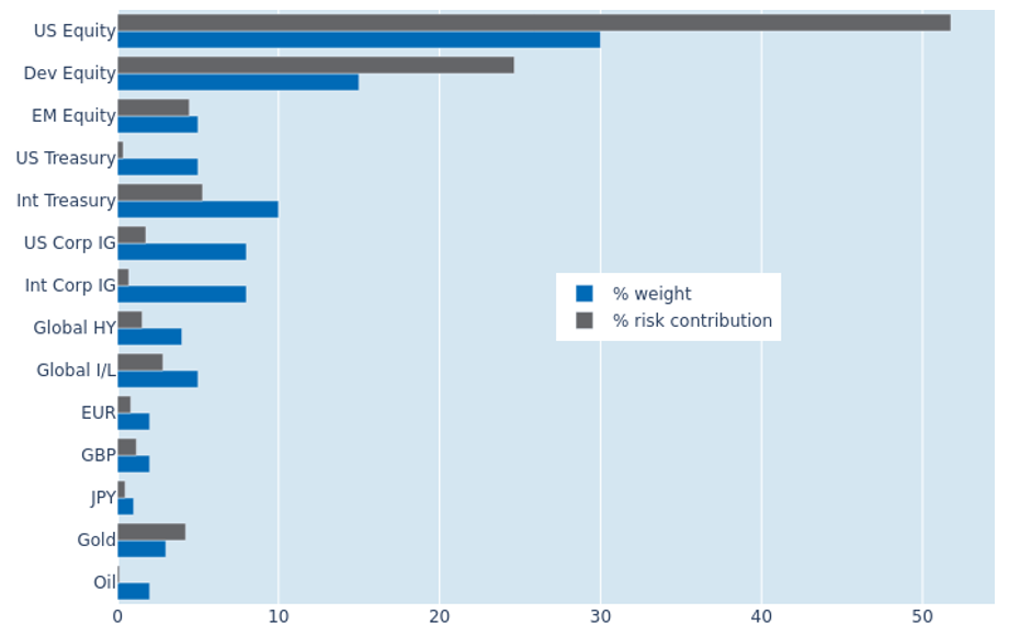 The predicted short-term risk of the Axioma global multi-asset class model portfolio eased back to 8.5% as of Friday, December 5, 2025, down from 9.3% a week earlier. The decrease was mostly due to lower stock market volatility, combined with a less intense co-movement of share and bond prices. US investment grade corporates were the biggest beneficiaries, with their share of total portfolio volatility shrinking from 2.4% to 1.7%. US equities and Treasury securities also recorded declines in their percentage risk contributions of 0.5% and 0.3%, respectively.