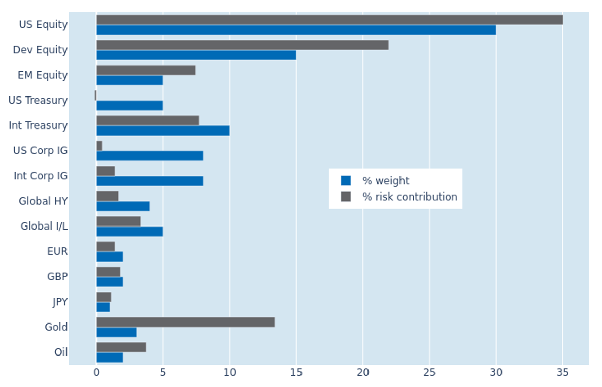 Increased volatility in gold prices and a stronger co-movement with share prices further raised the predicted short-term risk of the Axioma global multi-asset class model portfolio from 7.1% to 7.3% as of Friday, February 6, 2026. The precious metal saw its share of total portfolio volatility expand again from 10.4% to 13.4%, which is nearly 4.5 times its monetary weight of 3%. Most of the increase was caused by stronger fluctuations in gold prices, which now account for more than a quarter of its total risk contribution. Another 45% came from its strong positive correlation with non-USD securities, mostly due to its inverse relationship with the value of the greenback. Last week’s selloff and rebound in tech stocks also inflated the percentage risk contribution of US equities by two points to 35%, though part of the risk increase was offset by opposing movements in the bond market.