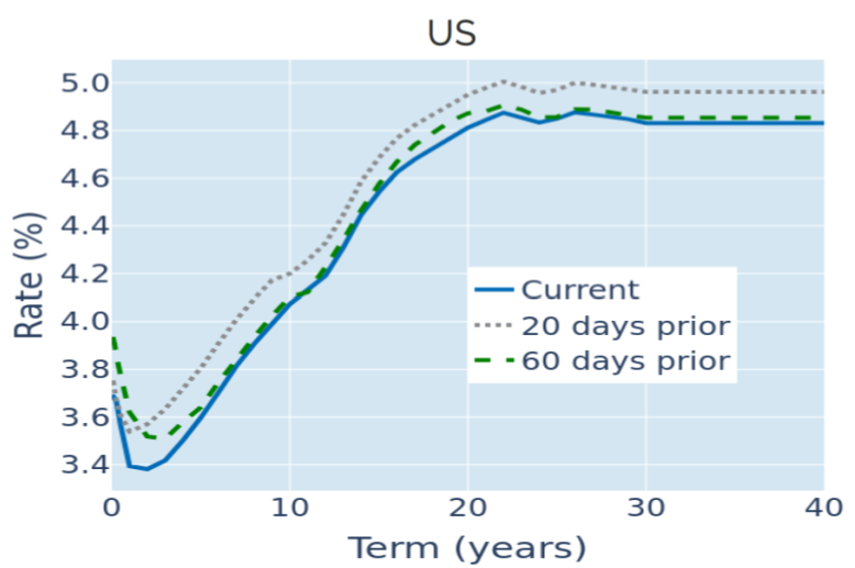 The Bureau of Labor Statistics reported on Friday that American headline consumer prices grew by 2.4% in the 12 months to January—down from 2.7% the month before and slower than the 2.5% predicted by analysts. In response, short-term interest rate traders lowered their monetary policy expectations, with the projected average federal funds rate for December 2026 ending the week 7 basis points lower at 3.03%. The move was propagated along the yield curve, pushing the 2-year point down 0.1% to its lowest level since September 2022.